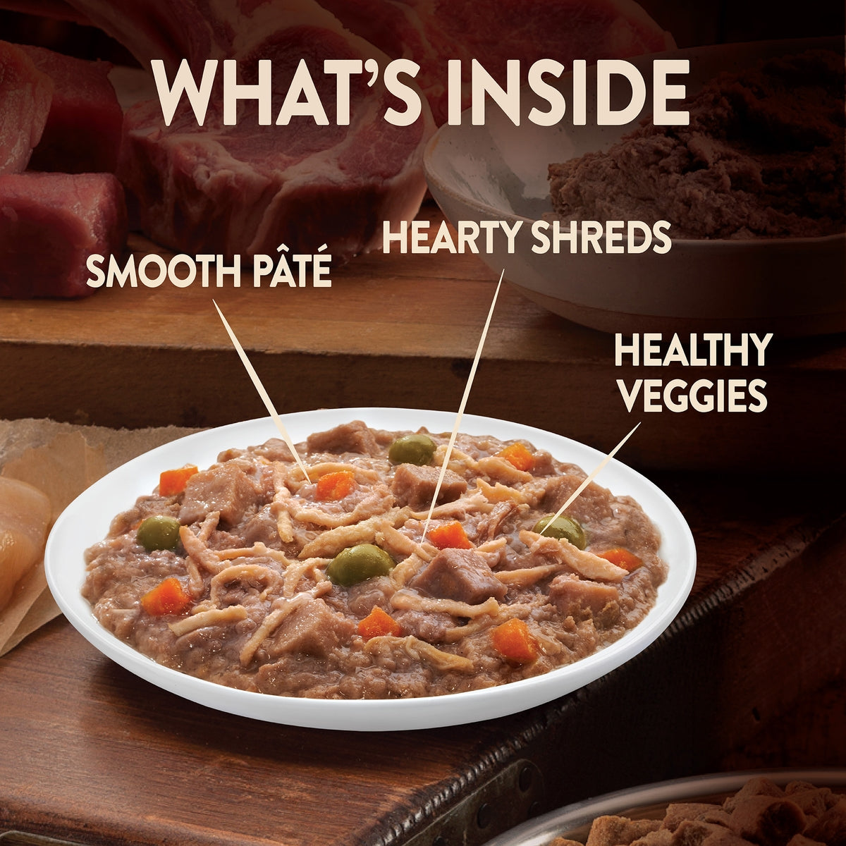 Small Breed Savoury Medleys Flavoured with Tender Chicken, Turkey, Carrots & Green Beans: Chicken 49%, Chicken Broth, Turkey 3%, Carrots 3%, Green Beans 3%, Potato Starch, Chicken Liver, Eggs, Minerals.